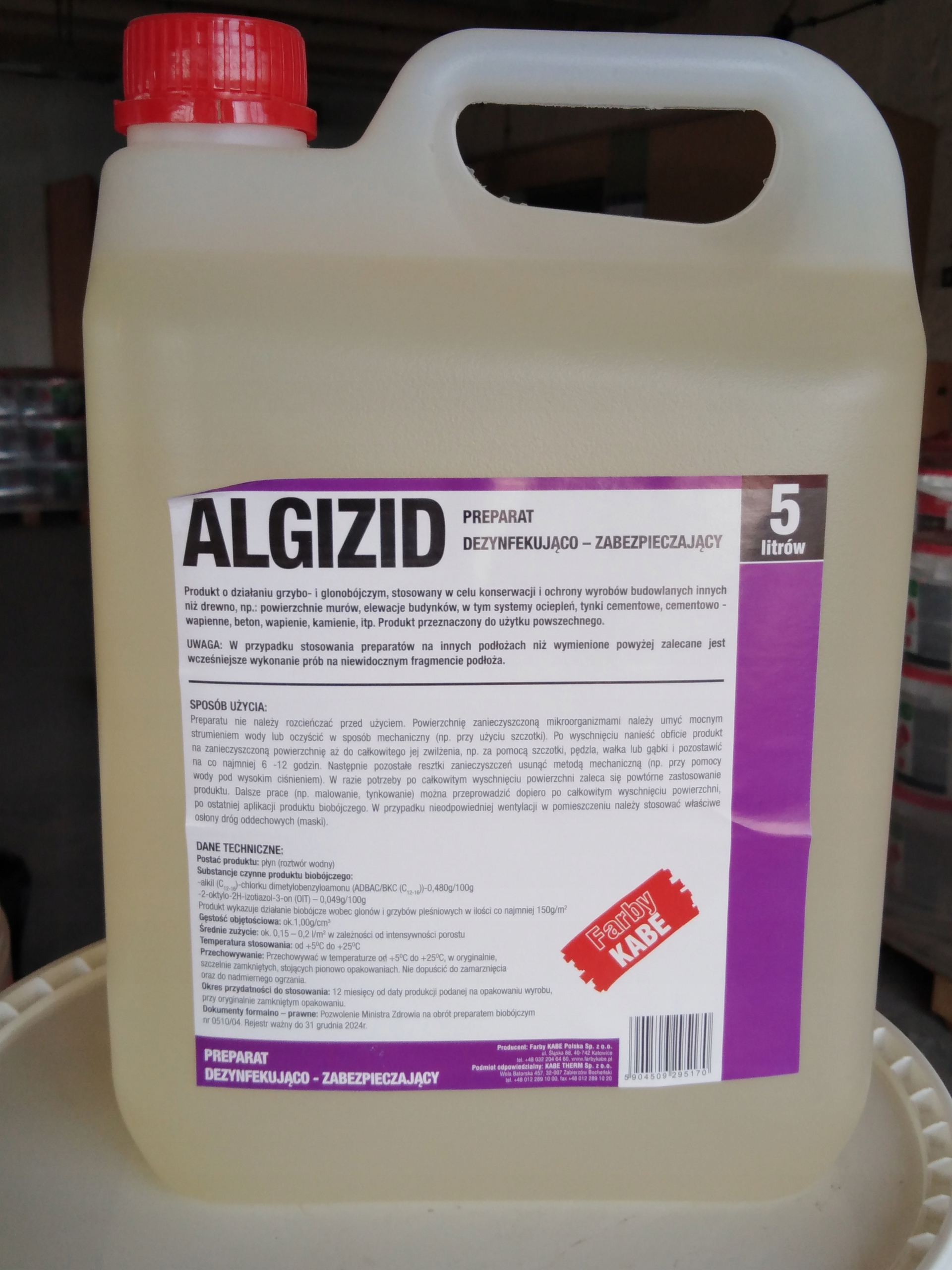 Uwaga: W przypadku stosowania preparatu na innych podłożach niż wymienione powyżej zalecane jest wcześniejsze wykonanie prób na niewidocznym fragmencie podłoża. W celu zapewnienia długotrwałej ochrony przed rozwojem glonów lub grzybów powierzchnię oczyszczoną preparatem ALGIZID należy zabezpieczyć tynkiem lub farbą z dodatkiem aktywnego środka powłokowego (usługa dodatkowa).