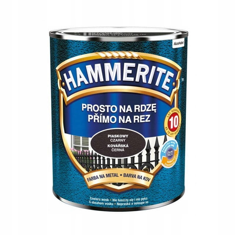 Hammerite Prosto Na Rdzę – piaskowy – to nowoczesna, jednoskładnikowa farba, schnąca na powietrzu, przeznaczona do antykorozyjnego i dekoracyjnego malowania metali żelaznych (stal, żeliwo), zarówno tych pokrytych rdzą, jak i czystych. Może być również stosowana do zabezpieczenia metali nieżelaznych po odpowiednim zagruntowaniu. Wykończenie w efekcie gładki połysk zapewnia niepowtarzalne walory estetyczne i długotrwałą ochronę antykorozyjną.