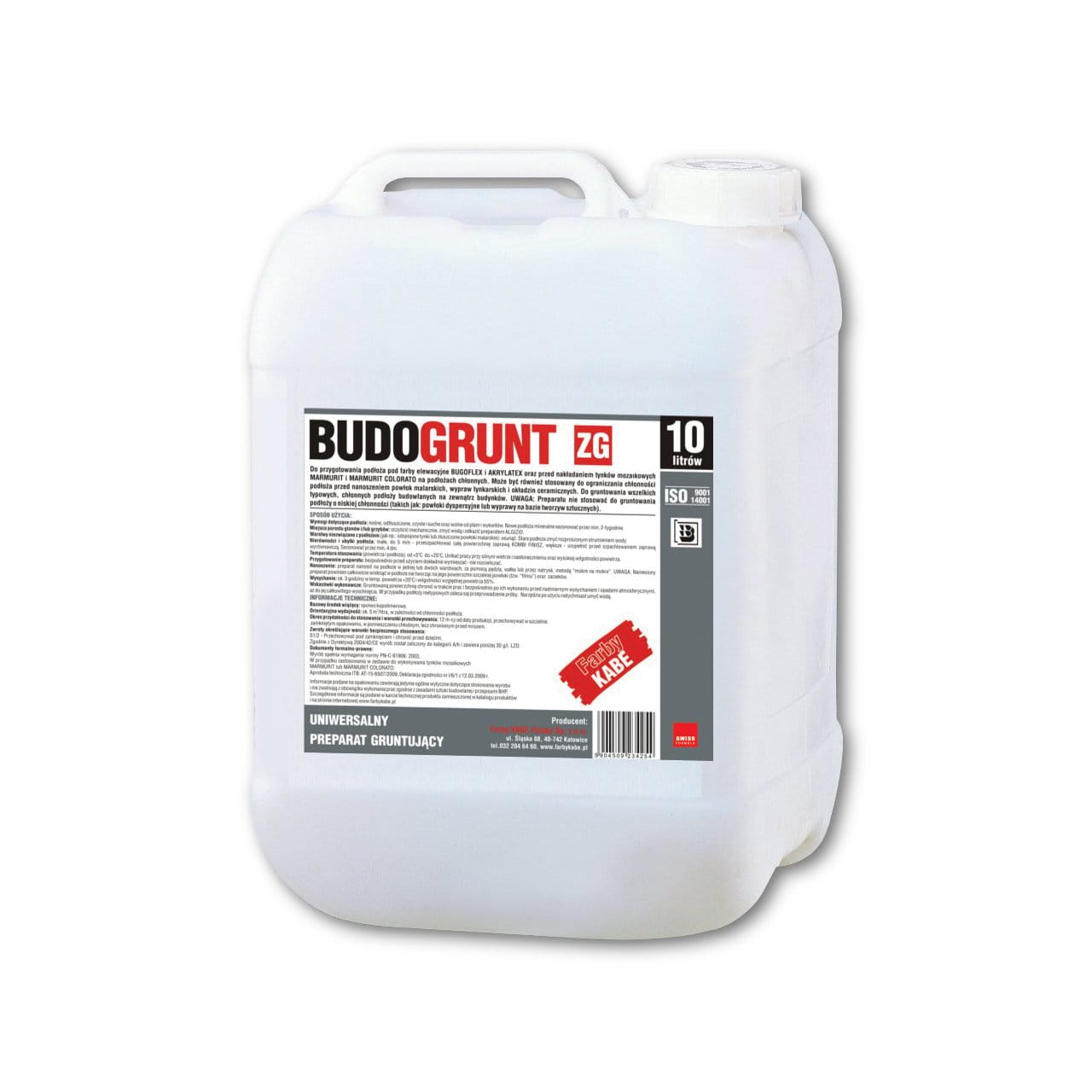 Marka: Farby KABE Opakowanie: 10 L Wydajność: ok. 5,0 m2/litr Czas schnięcia: ok. 24 h Średnie zużycie: 0,20l/m2 Ilość warstw: 1-2 Aplikacja: pędzel, wałek, natrysk Kod EAN: 5904509234254