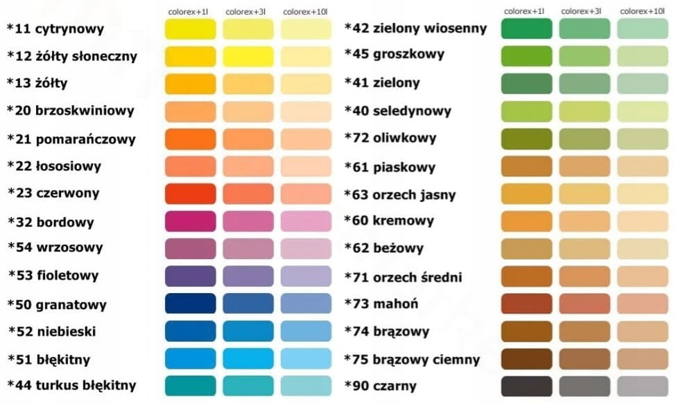 - Aby dobrać odpowiedni kolor barwionej farby, zaleca się wstępne zmieszanie COLOREX-u z farbą w mniejszej próbce i podsuszenie na ścianie (farby wodne można suszyć za pomocą wentylatora lub suszarki do włosów); ewentualne skorygowanie uzyskanego koloru można wykonać poprzez dodanie odpowiedniej ilości COLOREX-u lub farby.