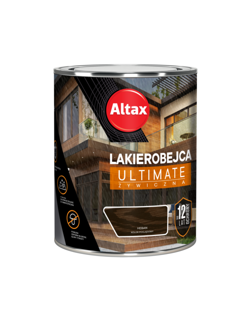 Altax Lakierobjeca Ultimate żywiczna zawiera system nowoczesnych żywic. które odżywiają drewno. jednocześnie skutecznie je zabezpieczając przez szkodliwym działaniem czynników atmosferycznych. chroni także powłokę przed grzybami i glonami. Uzyskany efekt utrzymuje się do 12 lat. Produkt efektowanie podkreśla rysunek drewna. nadając mu piękne. satynowe wykończenie. W palecie dostępnych jest 8 kolorów. Produkt należy stosować na drewno oszlifowane. Druga warstwa produktu może być nałożona już po 2h. a odporność na deszcz ma już po 1h!